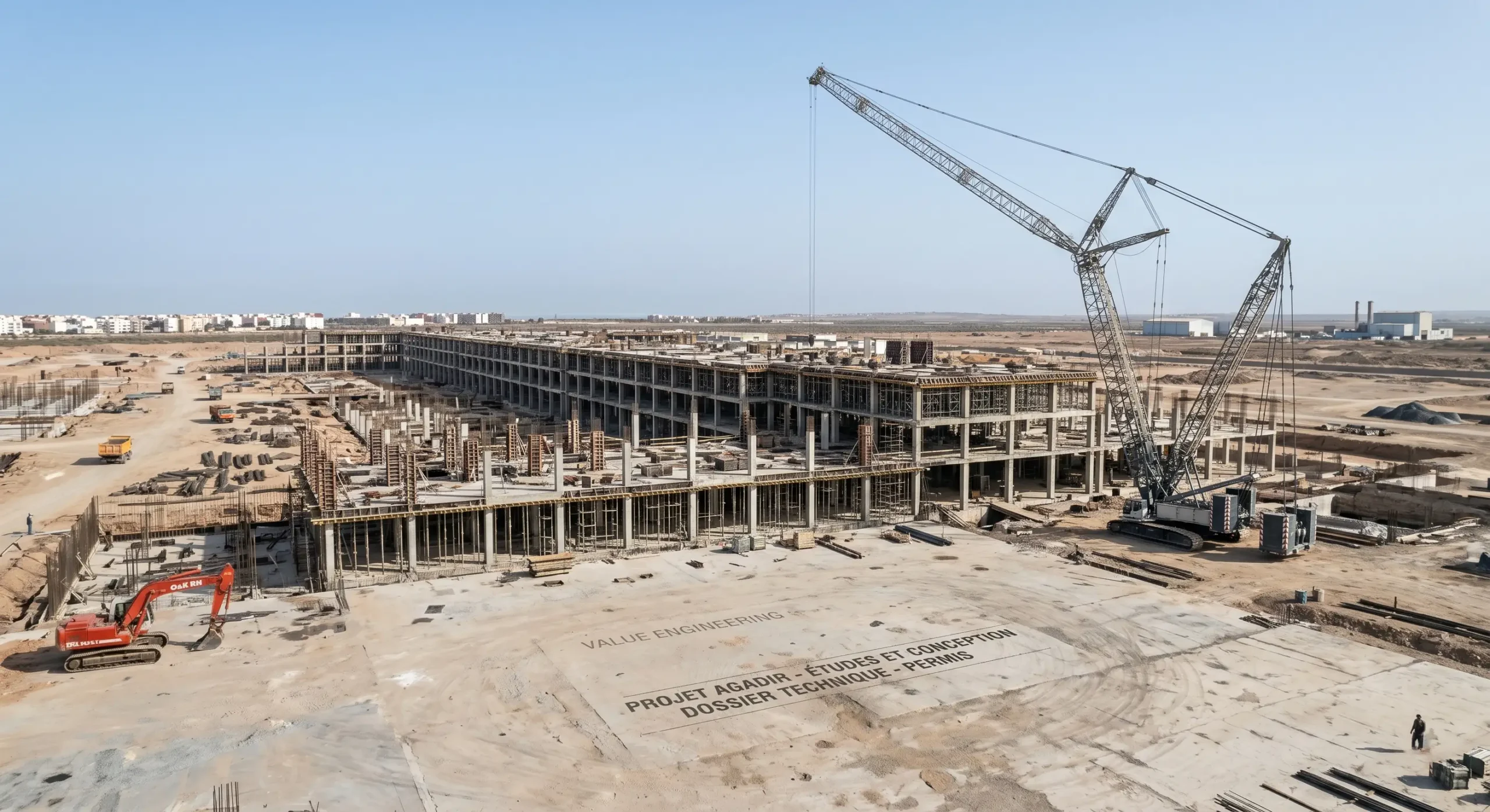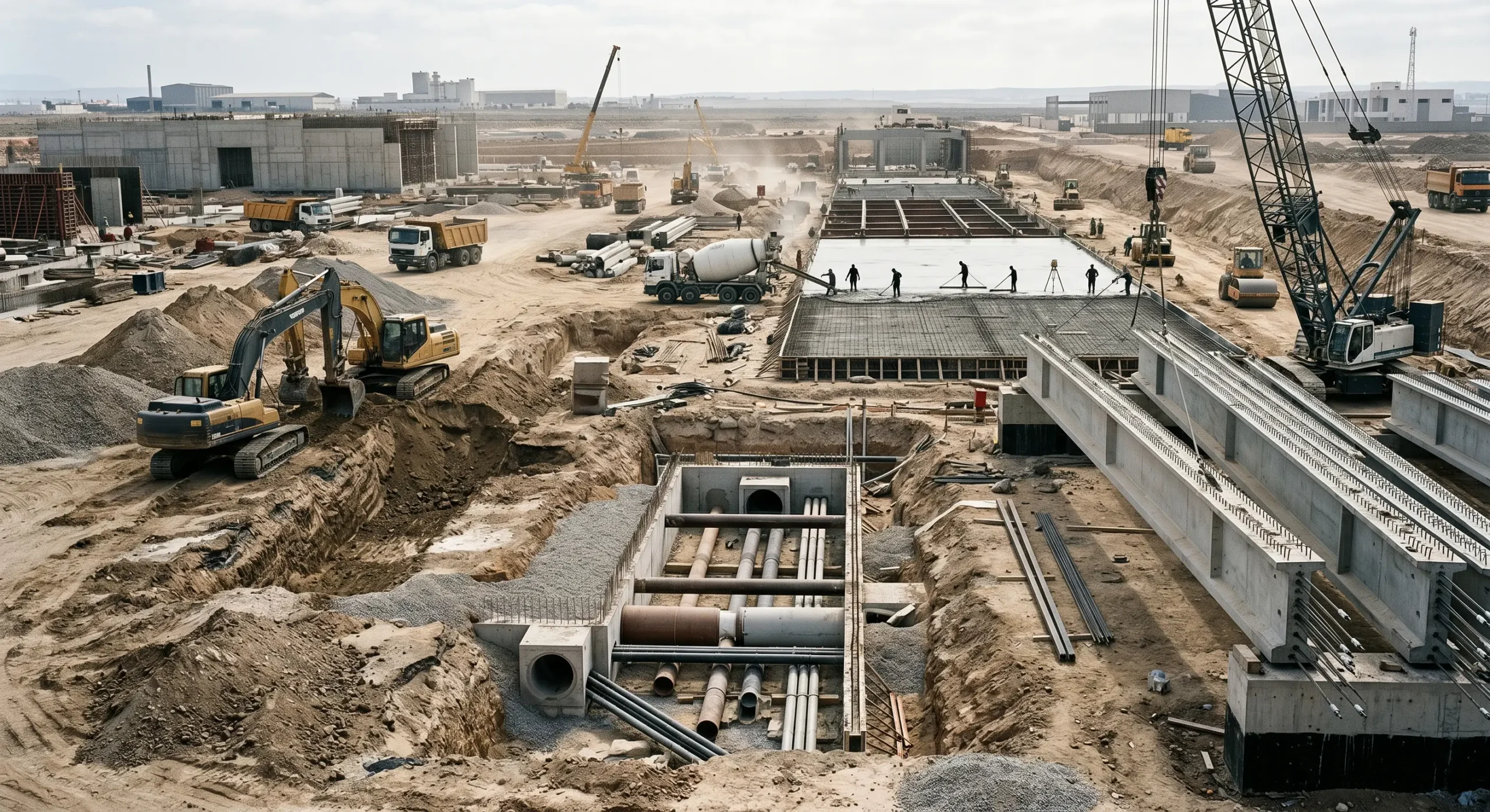 Terrassement, structures précontraintes, dallages, VRD et infrastructure